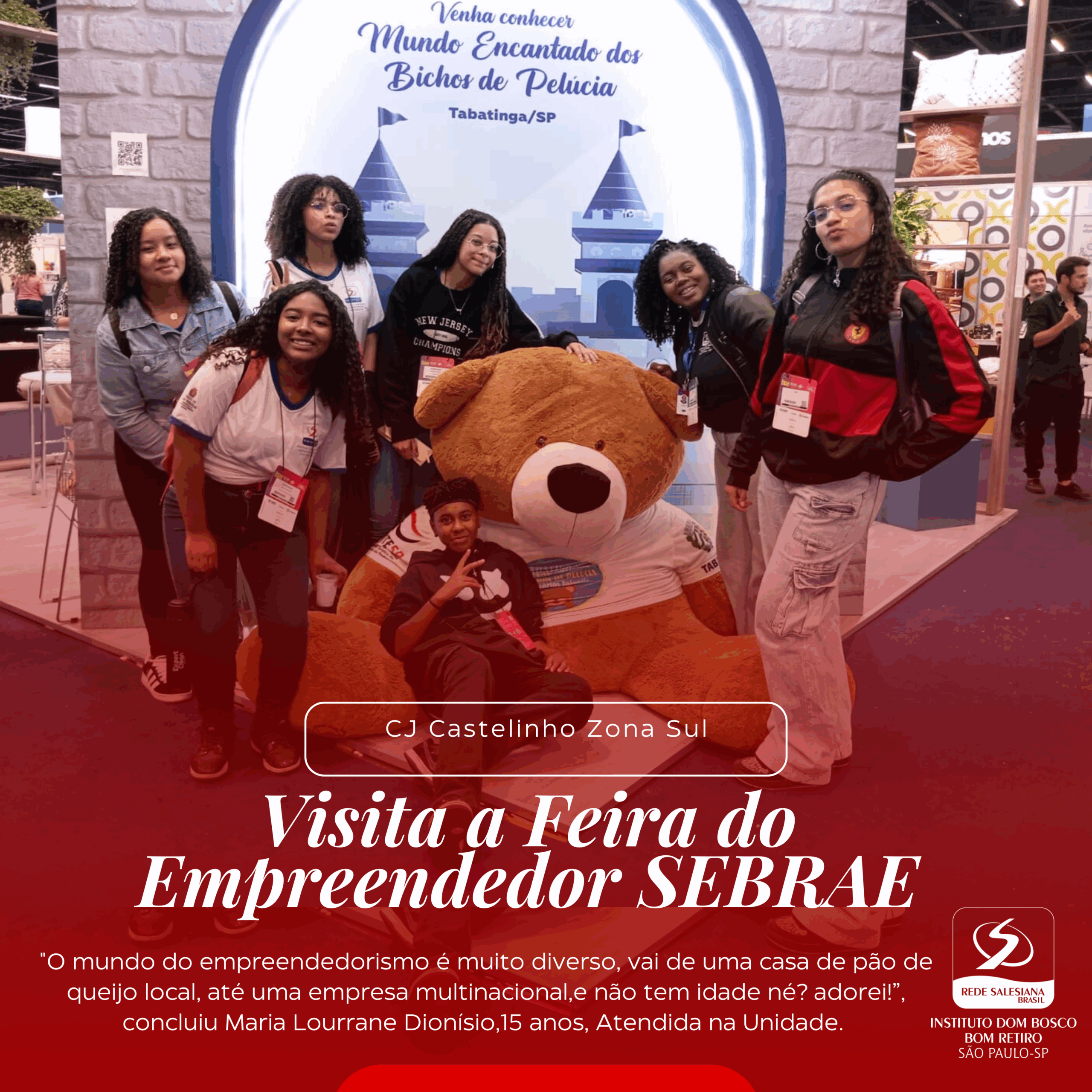 No dia 14 de Outubro, a turma do CJ Castelinho Dom Bosco esteve na Feira do Empreendedor Sebrae 2024 na EXPO SP. O intuito da visita foi agregar conhecimento em relação ao tema que foi trabalhado pela turma na EXPO do Instituto Dom Bosco: Empreendedorismo. “Foi  incrível ver tantas informações, ter tantas oportunidades de conhecer e explorar o que os Educandos gostam e tinham dúvidas.”, disse Gisele Silva, Educadora do CJ.