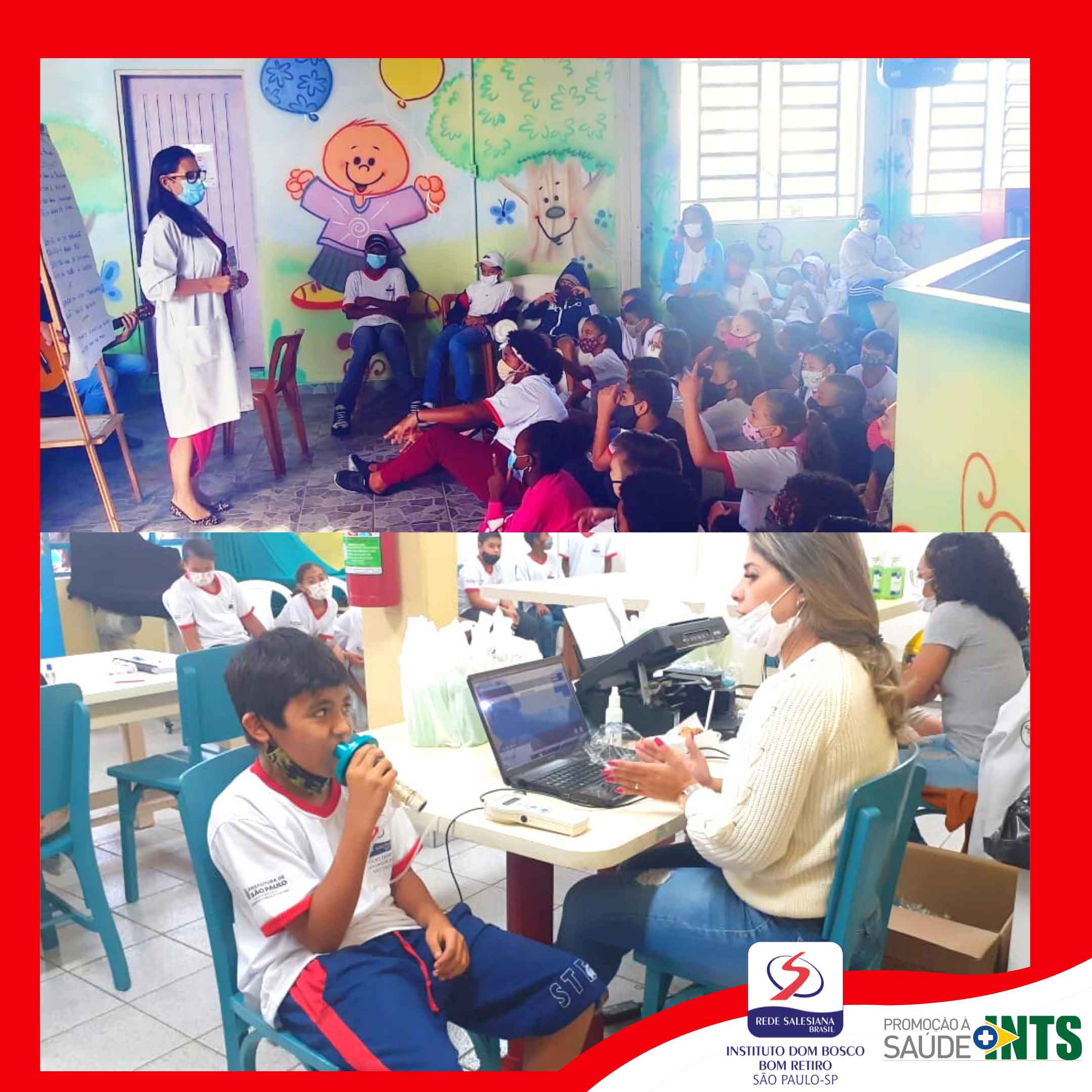 Já no dia 07, foi o momento de realizar o exame de função pulmonar com Atendidos. A ação, em parceria com INTS, consistia em: uma triagem com os jovens e depois era necessário em algumas etapas, soprar um aparelho e assim, saber como está a função pulmonar.