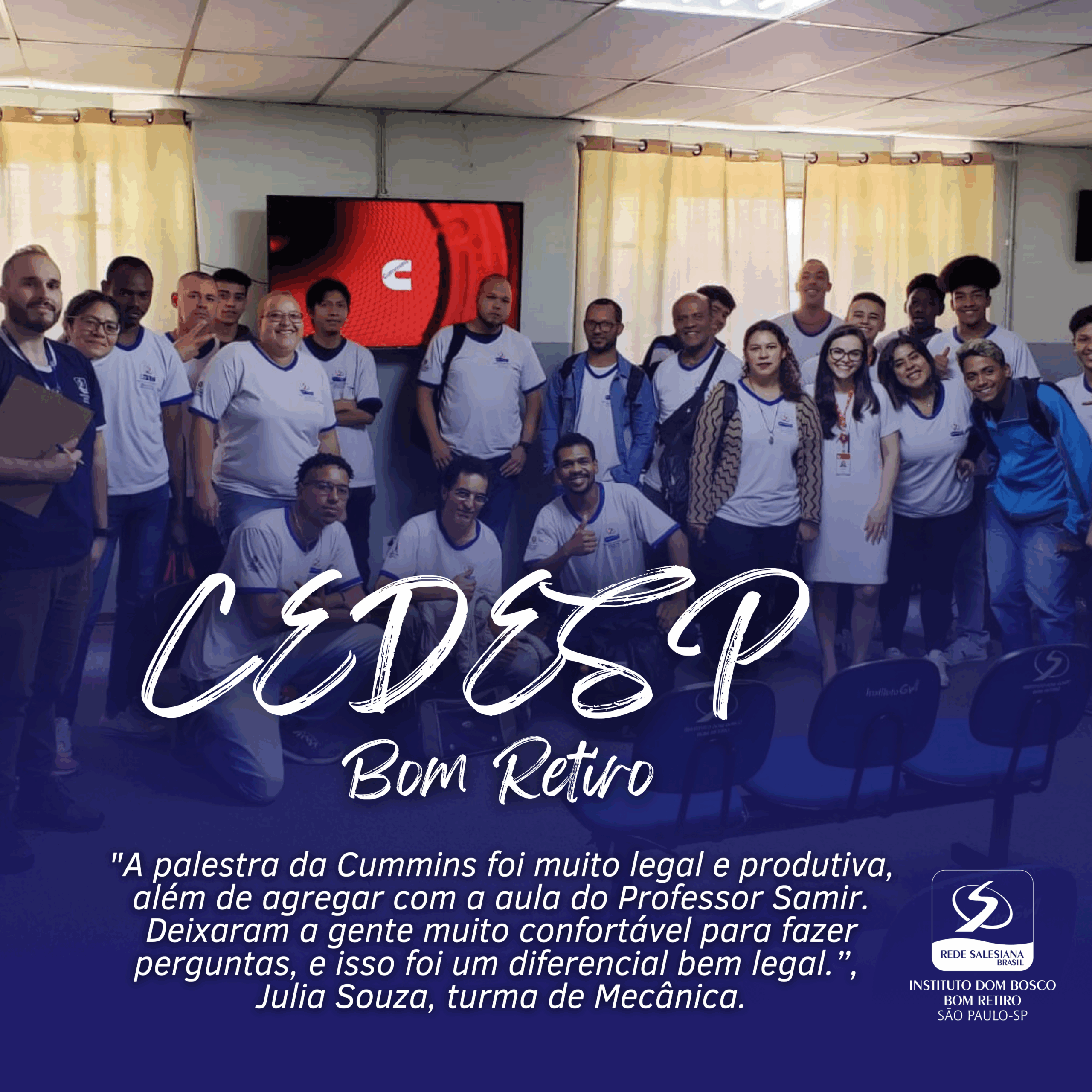 No dia 8 de novembro Educadores e Educandos do CEDESP Bom Retiro do Instituto Dom Bosco cursos: Mecânica Automotiva, Eletricista e Comandos receberam a Equipe da Cummins Brasil para realização do Workshop relacionado a geradores e como são compostos em características e suas funções. No primeiro momento uma dinâmica de apresentação entre os Atendidos e os Convidados, onde além de seus nomes e respectivas áreas, aqueles que estão em formação contaram ainda sobre suas perspectivas para o futuro.
