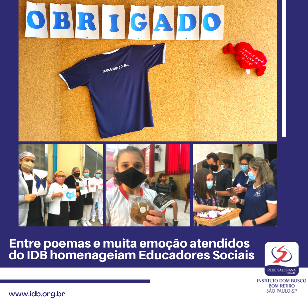 No mês de setembro (19), celebramos o Dia do Educador Social. Para comemorar a data, as Unidades Bom Retiro Centro, Vila Paulistana Zona Norte e Castelinho Dom Bosco Zona Sul, do Instituto Dom Bosco São Paulo SP, realizaram junto com os serviços: Centro para Crianças e Adolescentes Programa Vida Melhor – CCA PROVIM; Centro para Juventude – CJ; Centro de Desenvolvimento Social e Produtivo – CEDESP; Medidas Sócio Educativas – MSE e Núcleo de Convivência do Idoso – NCI, as mais diversas homenagens como: vídeos, cordéis, poemas, músicas em formato de serenata, desafios lançados pelo CCA PROVIM BR, cartazes, desenhos personalizados pelo CCA PROVIM Castelinho DB ZS, café da tarde, bombons entre muitos outros momentos emocionantes.