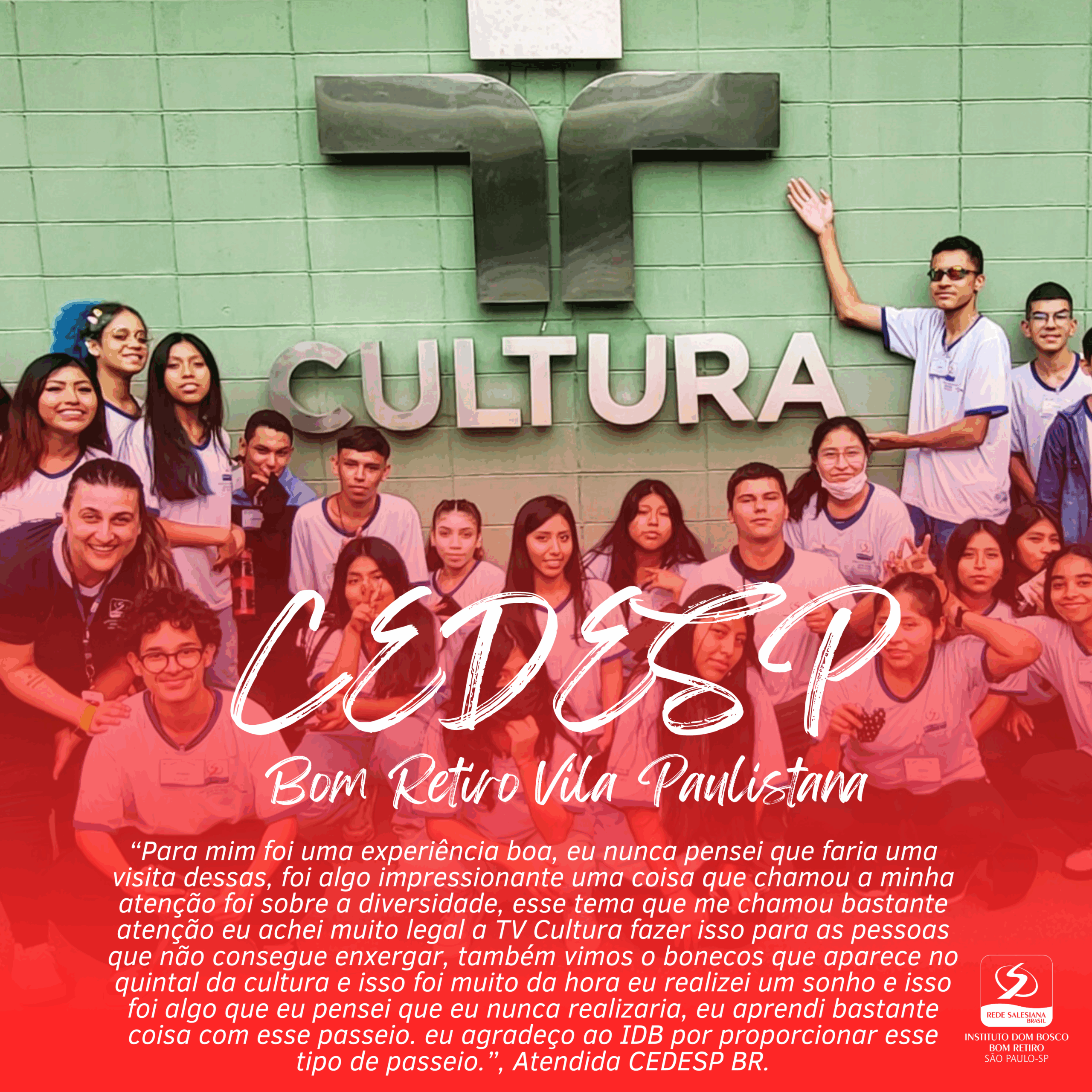 “Para mim foi uma experiência boa, eu nunca pensei que faria uma visita dessas, foi algo impressionante uma coisa que chamou a minha atenção foi sobre a biodiversidade, esse tema que me chamou bastante atenção eu achei muito legal a TV Cultura fazer isso para as pessoas que não consegue enxergar, também vimos o bonecos que aparece no quintal da cultura e isso foi muito da hora eu realizei um sonho e isso foi algo que eu pensei que eu nunca realizaria, eu aprendi bastante coisa com esse passeio. eu agradeço ao IDB por proporcionar esse tipo de passeio.”, Atendida do Curso.