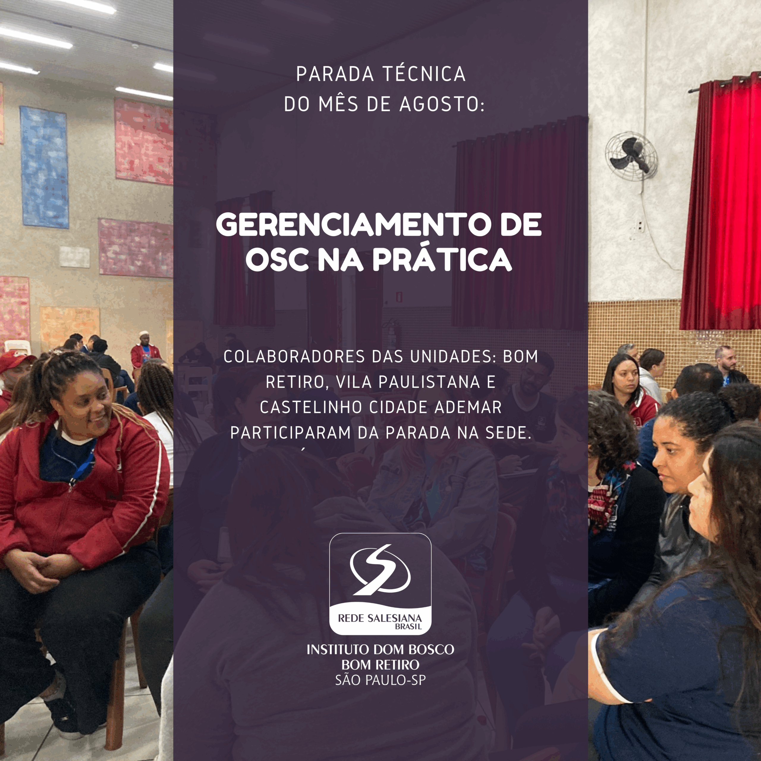 No dia 30 de agosto foi realizada a Parada Técnica mensal do Instituto Dom Bosco. Nesta formação os Educadores das Unidades Vila Paulistana, Cidade Ademar e Bom Retiro, reuniram-se na Sede da Obra. A Parada iniciou com a turma de Pastoral abordando o tema: Oração, fortalecendo a importância do agir. Durante o momento, a Equipe comparou passagens da bíblia com o sistema preventivo de Dom Bosco “Nas palavras de Jesus, Dom Bosco fundamentou sua vida e ação!”, para finalizar a primeira parte, uma oração aos jovens.