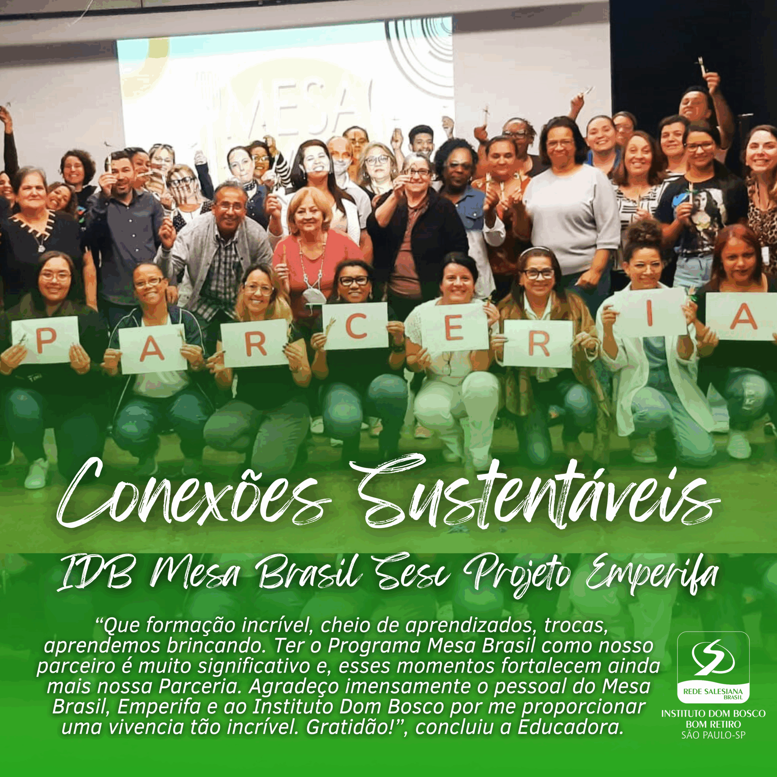 No dia 10 de agosto, a Educadora Pâmela Fernanda Silva, do setor Administrativo do Instituto Dom Bosco, participou da Formação do Mesa Brasil – Conexões Sustentáveis: Fortalecendo parcerias significativas no SESC do Carmo, com outras Instituições e o Projeto Emperifa. Pensando no fortalecimento entre Instituições Sociais, o Projeto e o Programa, o Mesa Brasil Sesc traz esta reunião como uma forma de reconexão com as Instituições parceiras, sensibilizando sobre a importância, os caminhos e a corresponsabilidade dentro de Parcerias entre Instituições.