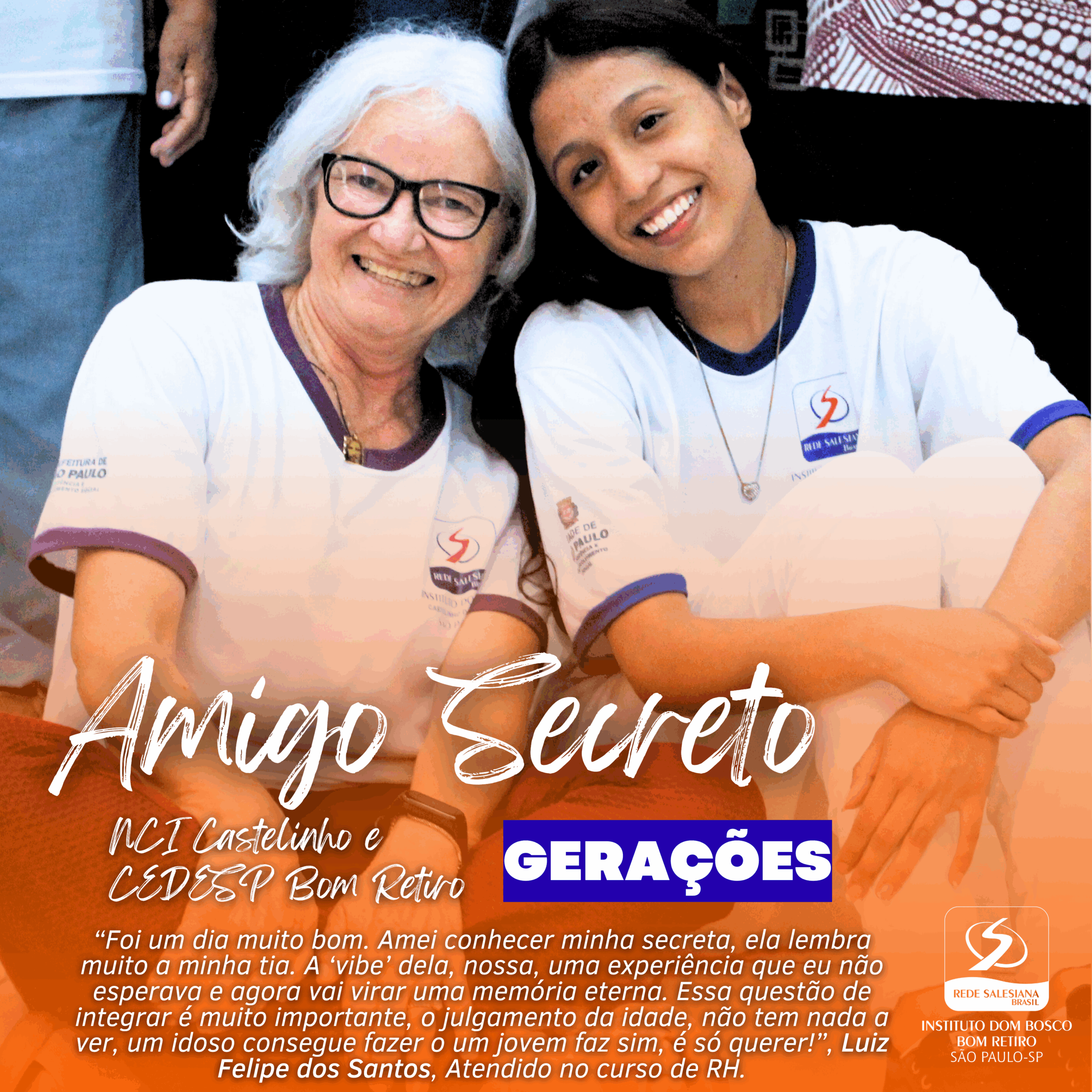 “Foi um dia muito bom. Amei conhecer minha secreta, ela lembra muito a minha tia. A ‘vibe’ dela, nossa, uma experiência que eu não esperava e agora vai virar uma memória eterna. Essa questão de integrar é muito importante, o julgamento da idade, não tem nada a ver, um idoso consegue fazer o um jovem faz sim, é só querer!”, Luiz Felipe dos Santos, Atendido no curso de RH.