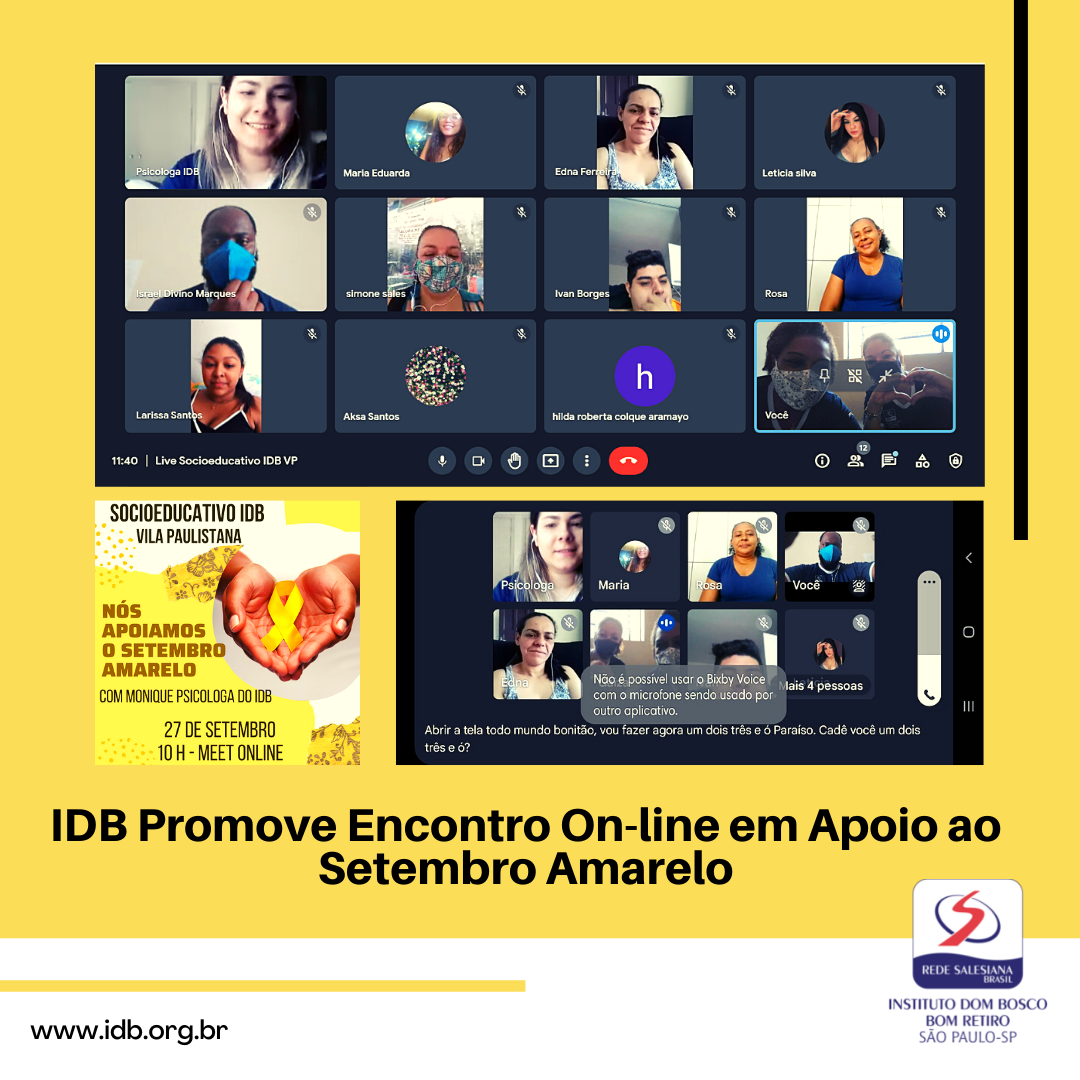 No dia 27 de setembro, a fim de propiciar momento de encontro, partilha, discussão, troca e construção de novos saberes a partir do Setembro Amarelo e os desafios de refletir sobre a Prevenção contra o Suicídio, os Educadores Socioeducativos do Instituto Dom Bosco São Paulo SP, Unidade Vila Paulistana, realizaram um momento virtual através do Google Meet com os atendidos do Centro de Desenvolvimento Social e Produtivo CEDESP. A reunião foi promovida por Flávia Sousa, Mundo do Trabalho, Gaiza Santos, Matemática, Israel Marques, Formação Humana e Monique Carvalho, Psicóloga no IDB.