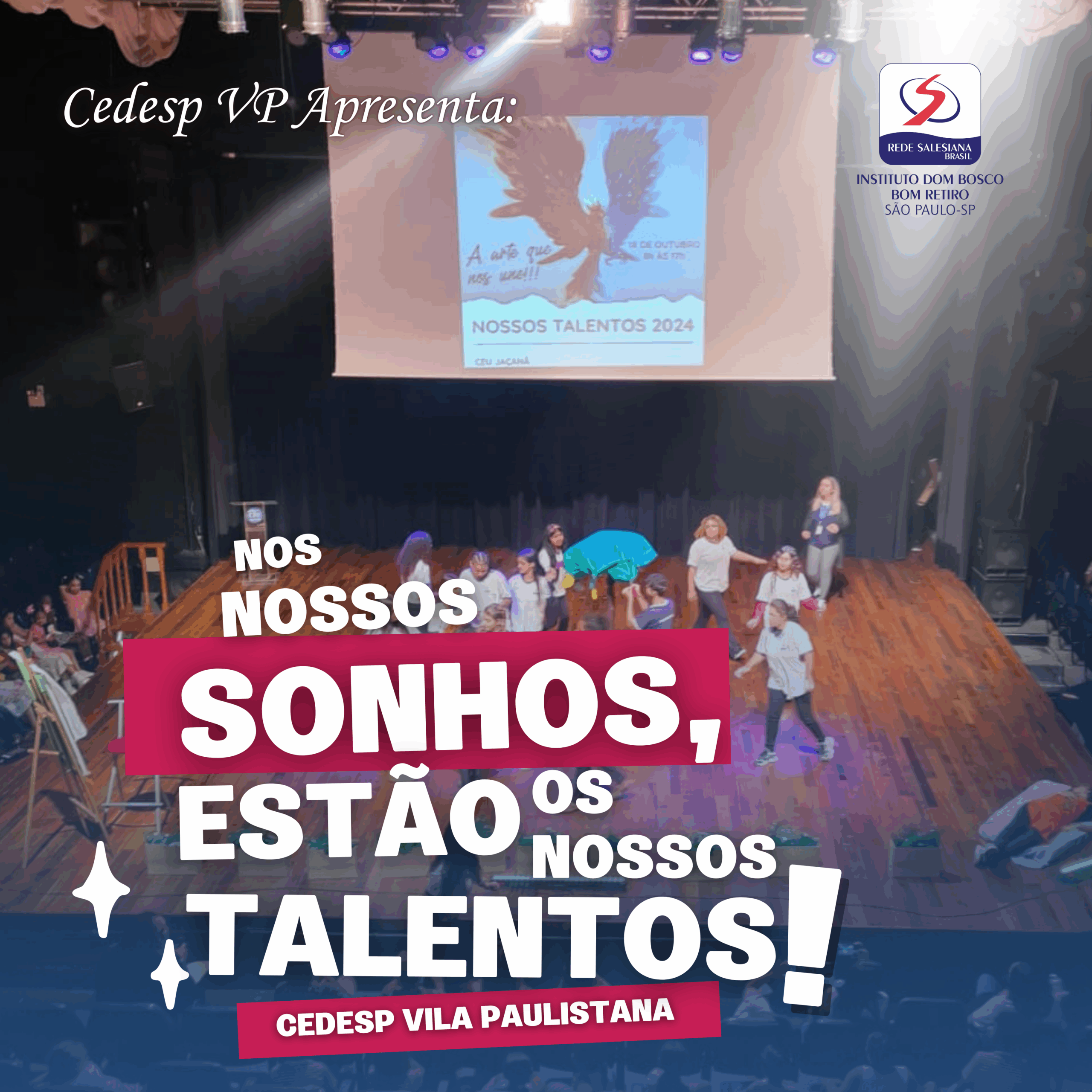 Com o tema “A arte que nos une”, o CEDESP Dom Bosco Vila Paulistana apresentou no dia 18 de outubro o espetáculo:Nos nossos Sonhos, estão os nossos Talentos!”, o qual foi inspirado pela estreia salesiana 2024: “O sonho que vos faz sonhar”. O evento contou com um público de aproximadamente 650 pessoas, considerando os períodos manhã e tarde. As apresentações foram realizadas no CÉU Jaçanã e foi promovida pelo CRAS JT. O objetivo principal do evento é promover a integração dos educandos da rede socioassistencial, estimular e evidenciar o potencial criativo de crianças, adolescentes, jovens e idosos, atendidos pelos serviços parceirizados com a Prefeitura; além de proporcionar um espaço de valorização e reconhecimento da riqueza cultural.