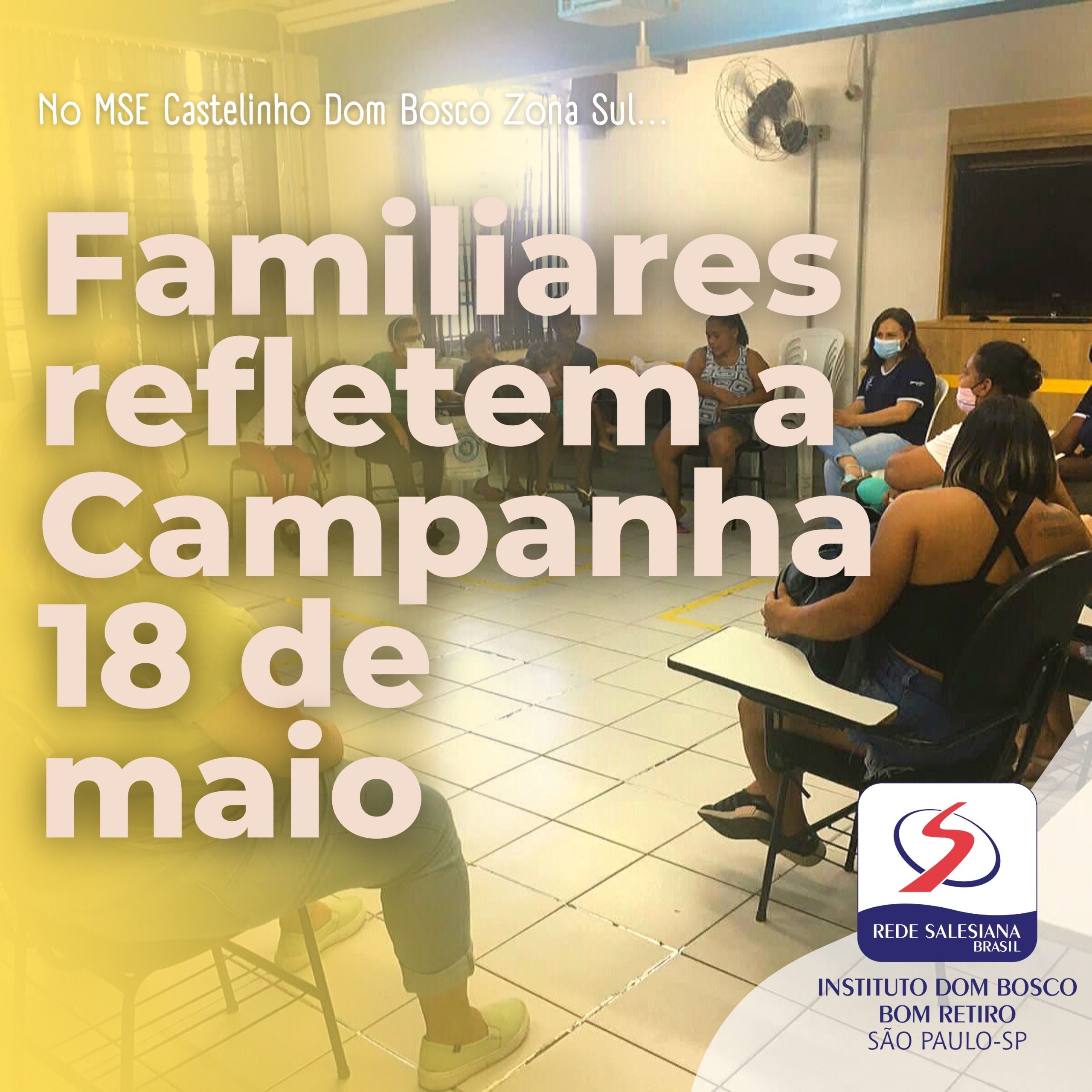 No dia 28 de abril, os Familiares dos Atendidos do Serviço de Medida Sócioeducativa MSE do Castelinho Dom Bosco Zona Sul – Instituto Dom Bosco São Paulo, estiveram na reunião de família com Marineusa Silva e Talita Ramos, Técnicas Especializadas do Serviço, onde o intuito era propor a reflexão acerca da campanha: “18 de maio – Contra o abuso e exploração sexual de crianças e adolescentes”.