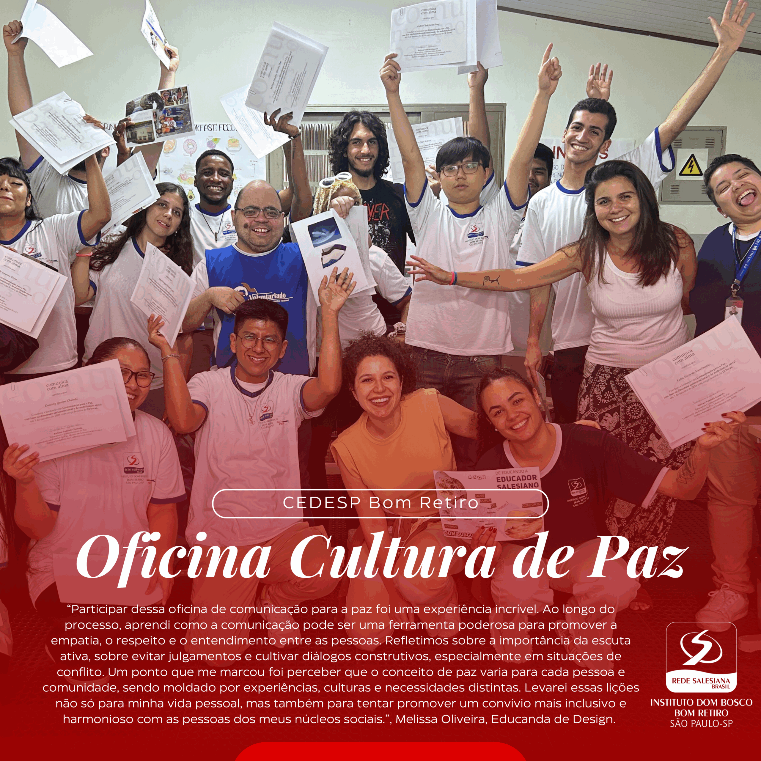Durante o mês de agosto, com conclusão no dia 01 de outubro, a palestrante Bárbara Tomiatti Giancola, promoveu a Oficina Cultura de Paz com os atendidos do CEDESP Bom Retiro. Durante os encontros participaram: Lidia Nascimento, Secretaria, Paula Macedo, Educadora de Formação Humana, Voluntários e Educandos dos cursos de: Inglês, Comandos, Design, RH e ADM. A oficina surge como uma resposta necessária em tempos em que a saúde mental, a exclusão, a intolerância e a violência se tornaram desafios globais prementes. É urgente, mais do que nunca, aprender a conviver, respeitar as diferenças e promover a cultura de paz.