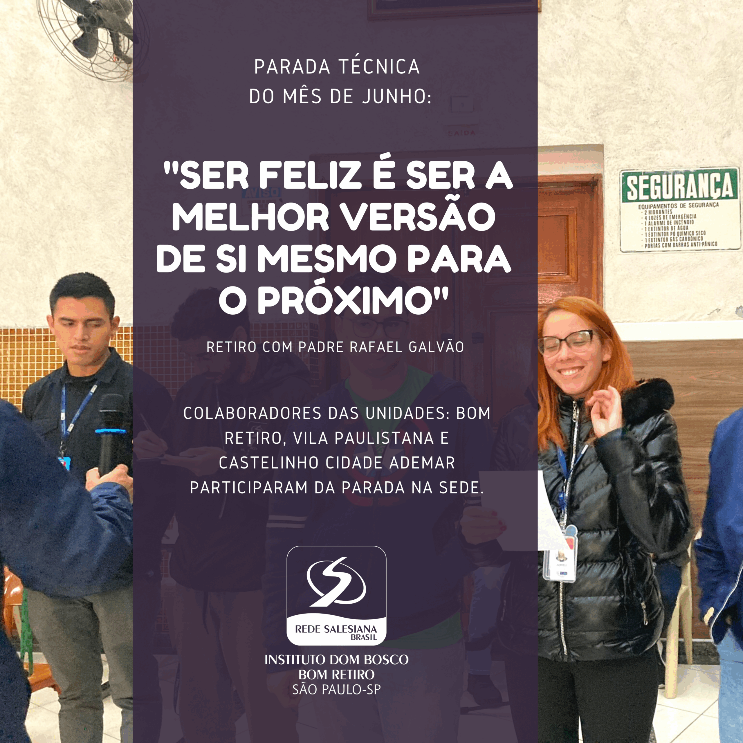 No dia 30 de junho, foi realizada a Parada Técnica do Instituto Dom Bosco, na Sede do Bom Retiro, com todas as demais Unidades participantes: Vila Paulistana e Cidade Ademar. Desta vez, a Parada teve a proposta de Retiro, onde os Colaboradores pudessem refletir acerca do tema proposto de maneira individual. Para esta formação, a Obra contou com a presença do Padre Cássio Rodrigo de Oliveira e Padre Rafael Galvão, inicialmente na Paróquia Nossa Senhora Auxiliadora, na sequência, Galvão, falou sobre Amor Próprio. Durante sua fala, Rafael enfatizou que amor é decisão e que: “Ser feliz é ser a melhor versão de si mesmo em função do próximo”. Após sua fala, ainda no primeiro momento, os Educadores puderam circular pela Obra, de forma livre, escolher seu espaço para sentar e etc, o importante era que cada um pudesse perguntar a si mesmo: “Quem sou?”
