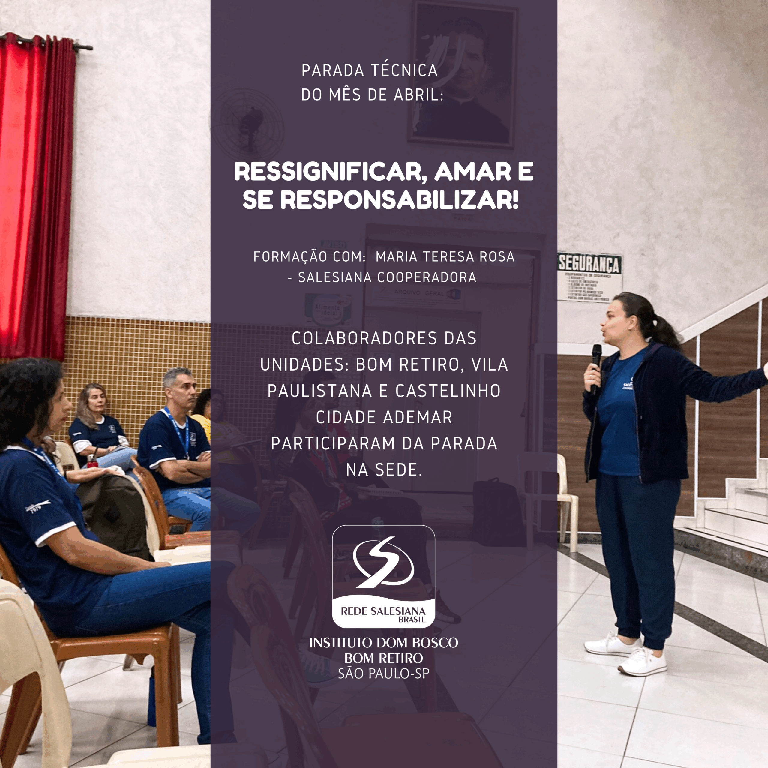 No dia 26 de abril foi realizada a Parada Técnica mensal do Instituto Dom Bosco com a presença das Unidades Vila Paulistana e Cidade Ademar na Sede com a turma do Bom Retiro. A galera da Pastoral iniciou a reunião propondo uma reflexão sobre os vulneráveis que trabalhamos e conhecemos, com imagens de ações solidárias e fundo musical da banda, a intenção foi de mentalização e boas energias. O momento de RH trouxe atualizações mensais e Alex Brito, Gestor Executivo da Obra, informou sobre os dois novos Serviços que o IDB irá conduzir temporariamente CCA e CEDESP da Unidade Lapa. A formação contou com a participação de Maria Teresa Rosas, Salesiana Cooperadora, com o tema: Carisma Salesiano enraizado na Sociedade. A conhecida “Tete”, trouxe três grandes nomes e exemplos de pessoas como Dom Bosco, onde ilustrou que independente das circunstâncias muitas vezes inoportunas, foi possível prosseguir e mais: ofertar aquilo que não conhecia, por exemplo, o Pai e Mestre da Juventude, foi órfão de Pai cedo, mas tornou-se “Pai” através da Pedagogia Salesiana. Teresa reforçou que isso só é possível quando olhamos para o outro, tornando assim a causa maior. “O importante é prosseguir, aproveitar as circunstâncias muitas vezes para amadurecer”, disse a Cooperadora.