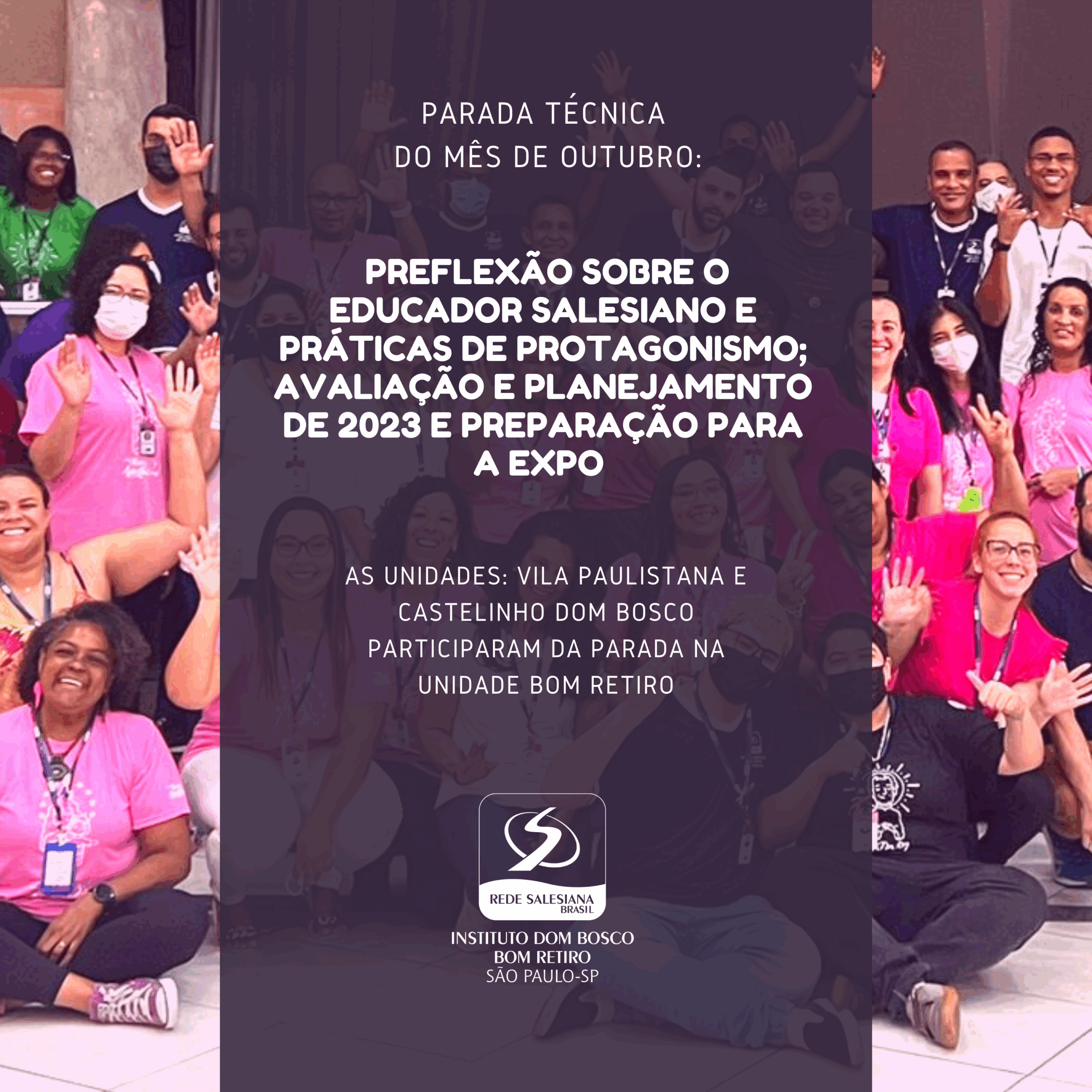 No dia 28 de outubro, foi realizada a Parada Técnica mensal do Instituto Dom Bosco São Paulo SP, a realização do momento formativo aconteceu na Unidade Bom Retiro com a presença da Equipe Técnica de todas as Unidades: Bom Retiro, Vila Paulistana e Castelinho Dom Bosco Zona Sul. Nesta sexta-feira, a formação, via ZOOM, foi realizada com a Equipe da Rede Salesiana Brasil, abordando a importância do Educador Salesiano, com a participação do Pe. Justo Ernesto Piccinini, Inspetor e Padre Cássio Rodrigo de Oliveira, SDB, Vice-inspetor da Inspetoria Salesiana de Nossa Senhora Auxiliadora, de São Paulo. A reflexão deu continuidade, trazendo cases de Educação Libertadora e Manifestos da Juventude em grande protagonismo. Nesta Parada, os Educadores puderam ainda avaliar a última formação, votar para os temas das próximas paradas de 2023 e preparar a casa para a EXPO que aconteceria no sábado (29).