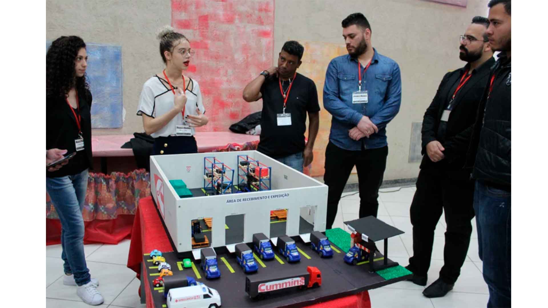 sua história e sua marca, mostrando inclusive a evolução do logo de 1944 a 1976 que permanece até os dias de hoje; a turma ainda abordou a linha do tempo, mídias sociais, curiosidades e os grupos de afinidades trabalhados na CUMMINS, um diferencial que agrega valor e agremia os colaboradores, através das afinidades com: pessoas com deficiência, Afrodescendentes, Geração Y, LGBTQ+ e Mulheres, finalizou com a apresentação do CUMMINS Aeos, um cavalo mecânico 4×2 classe 7 elétrico. A turma de Logística, desenvolveu uma maquete explicando o funcionamento interno, falando sobre o endereçamento de cargas, estrutura e organização.