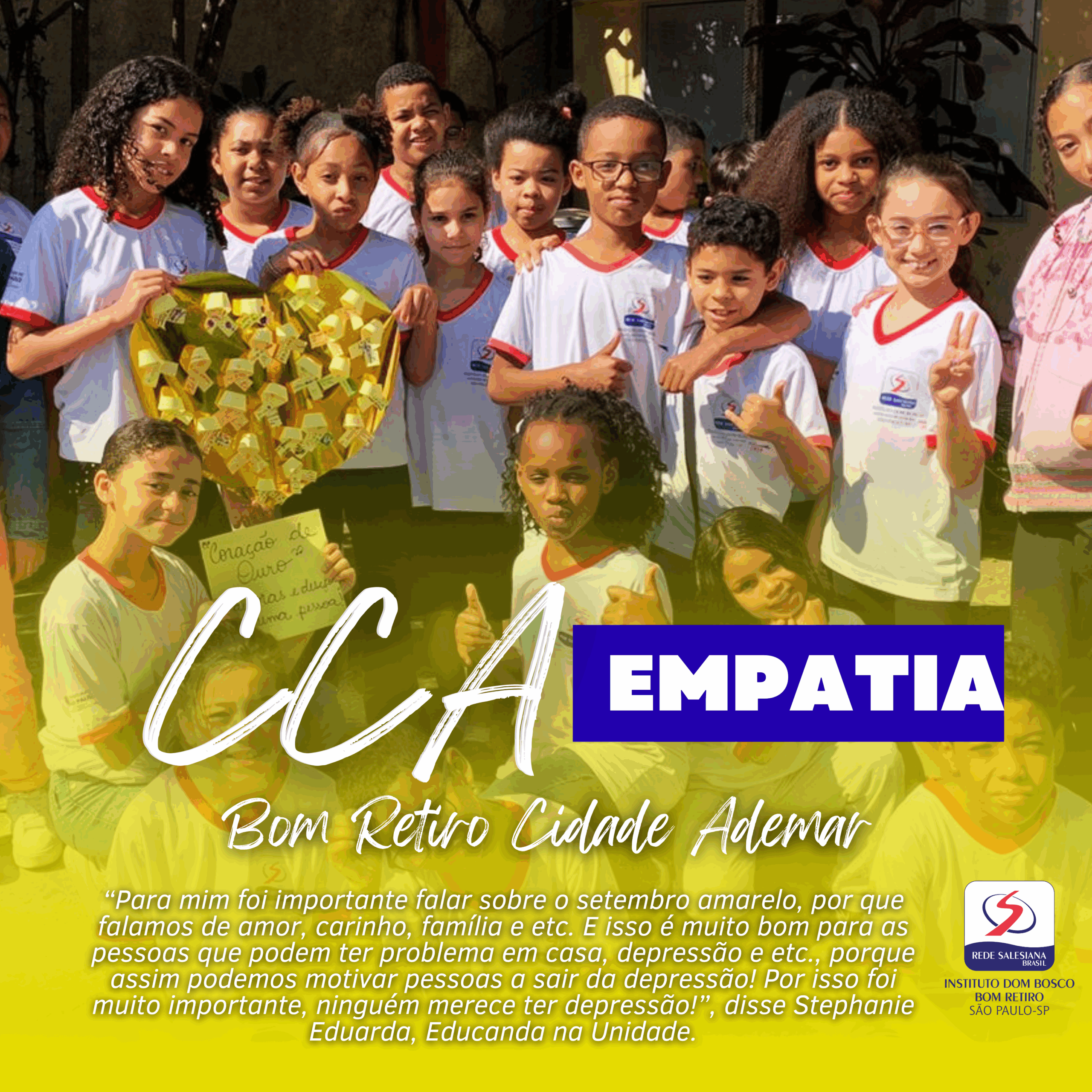 “Para mim foi importante falar sobre o setembro amarelo, por que falamos de amor, carinho, família e etc. E isso é muito bom para as pessoas que podem ter problema em casa, depressão e etc., porque assim podemos motivar pessoas a sair da depressão! Por isso foi muito importante, ninguém merece ter depressão!”, disse Stephanie Eduarda, Educanda na Unidade.
