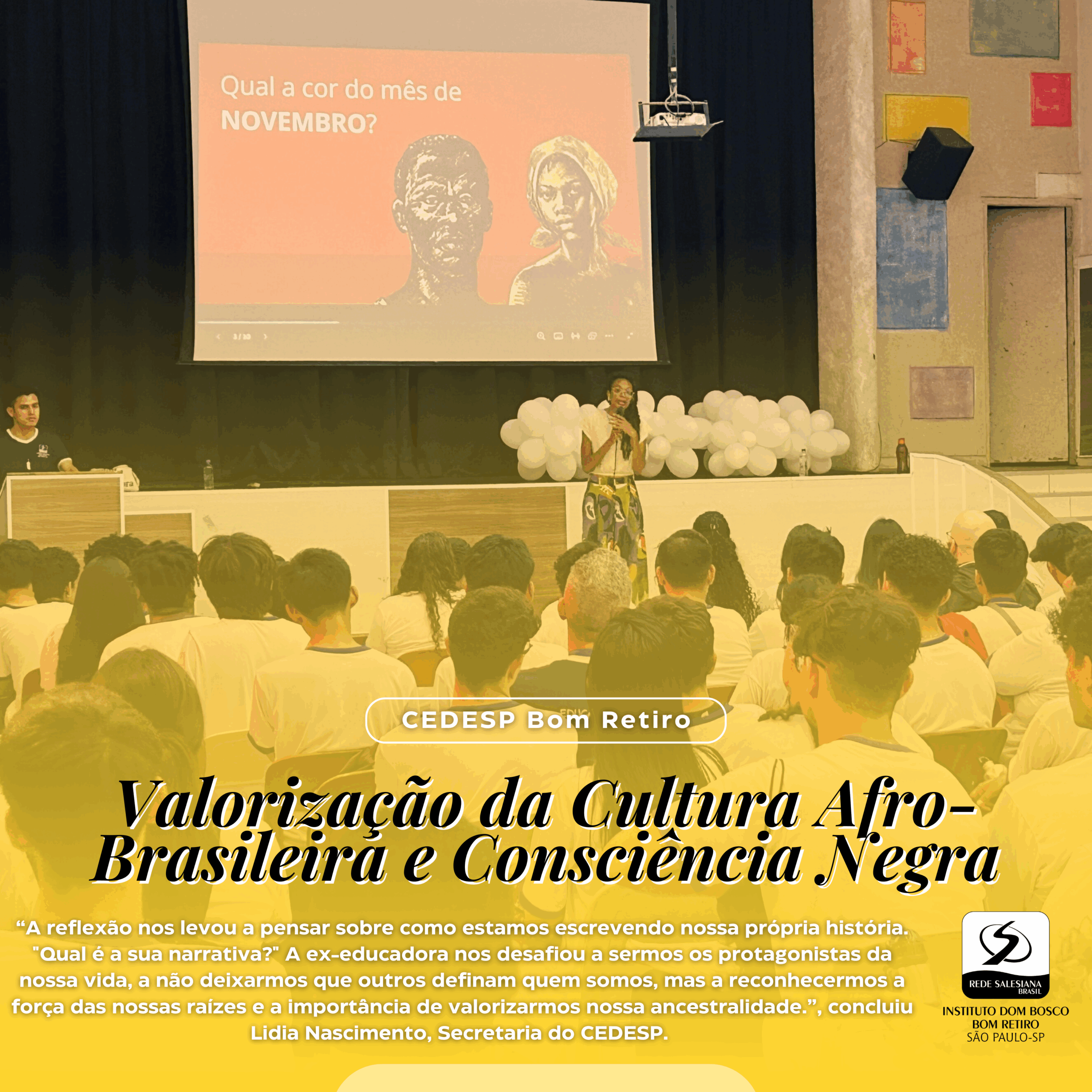 Na terça-feira (19), Roberta Ferreira, Educadora e Escritora, que já ministrou aulas no Instituto Dom Bosco no ano de 2018, esteve no IDB Bom Retiro para marcar o Dia da Consciência Negra com reflexões que vão além do convencional: Valorização da Cultura Afro-Brasileira e a Conscientização do Dia da Consciência Negra. Ao invés de falar apenas de datas e eventos históricos, Roberta convidou todos a olhar para a nossa própria história e identidade, com uma pergunta simples, mas poderosa: “Qual é a sua narrativa?”. Entre os ensinamentos fundamentais, a Educadora explicou que a África não é um país, mas um continente vasto e plural, com uma diversidade de culturas, línguas e tradições. Esses esclarecimentos ajudam a repensar a visão estreita que, muitas vezes, temos sobre a África e a sua contribuição para o mundo. A escritora trouxe conceitos poderosos da filosofia africana, como Sankofa, que nos ensina a “retornar ao passado, trazer para o presente e ressignificar o futuro”, o que nos faz entender que, para avançarmos, precisamos compreender nossas raízes e usar esse conhecimento para transformar nossa realidade. Em sua fala, o Ubuntu – “Eu sou porque nós somos”, também esteve presente. Essa ideia nos conecta com a importância da coletividade e da solidariedade. “Não somos seres isolados; nossa identidade é construída em comunidade, através do respeito e valorização do outro.”, afirmou Roberta.