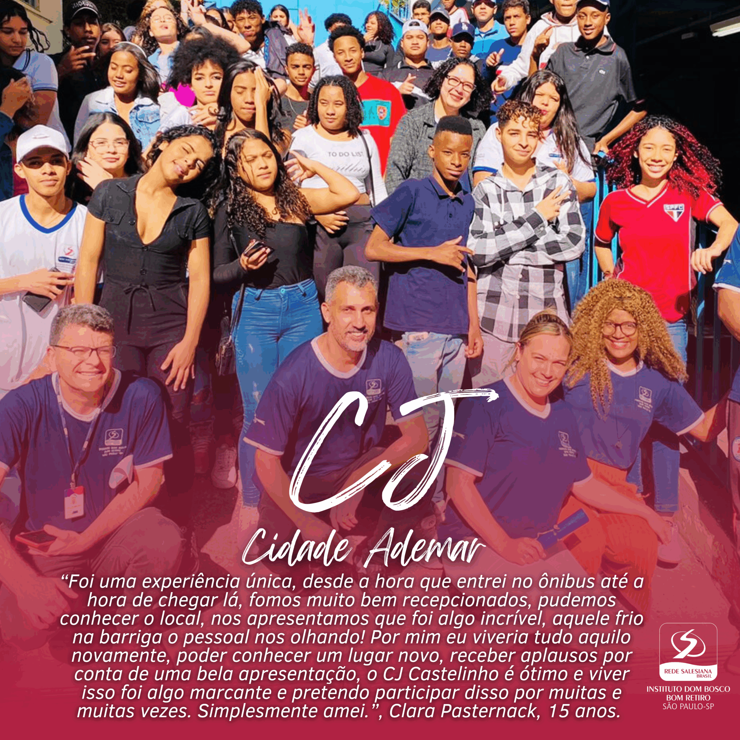 “Foi uma experiência única, desde a hora que entrei no ônibus até a hora de chegar lá, fomos muito bem recepcionados, pudemos conhecer o local, nos apresentamos que foi algo incrível, aquele frio na barriga o pessoal nos olhando! Por mim eu viveria tudo aquilo novamente, poder conhecer um lugar novo, receber aplausos por conta de uma bela apresentação, o CJ Castelinho é ótimo e viver isso foi algo marcante e pretendo participar disso por muitas e muitas vezes. Simplesmente amei.”, Clara Pasternack, 15 anos.