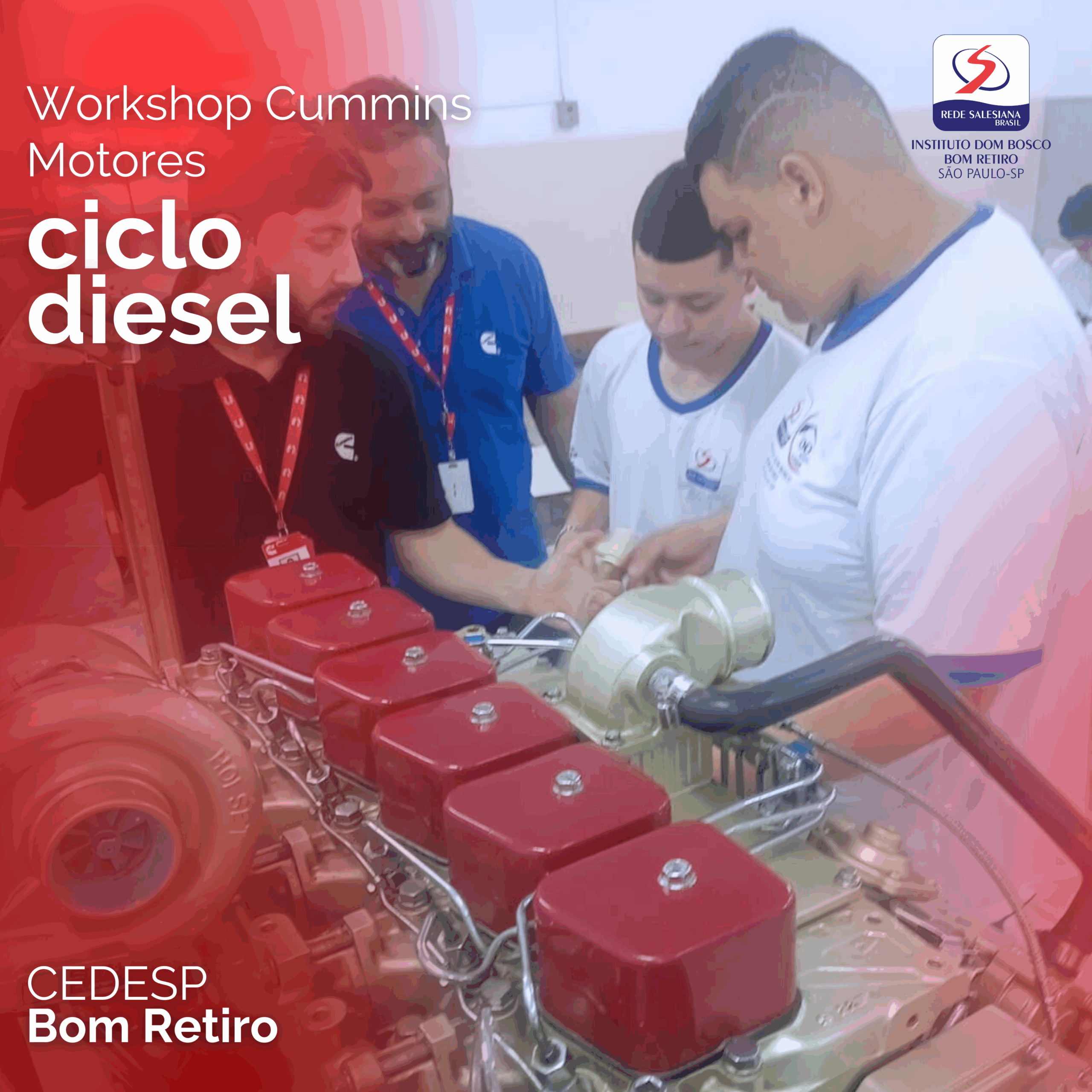 No início deste mês, a Cummins do Brasil, parceira do Instituto desde 2018, realizou com a turma do CEDESP Dom Bosco, Unidade Bom Retiro, curso de Mecânica Ciclo Otto o Workshop: Familiarização em motores ciclo Diesel Cummins. A formação durou três dias, sendo de 04 até 06 de novembro. O objetivo principal foi apresentar componentes e funcionamento dos motores ciclo diesel da empresa.